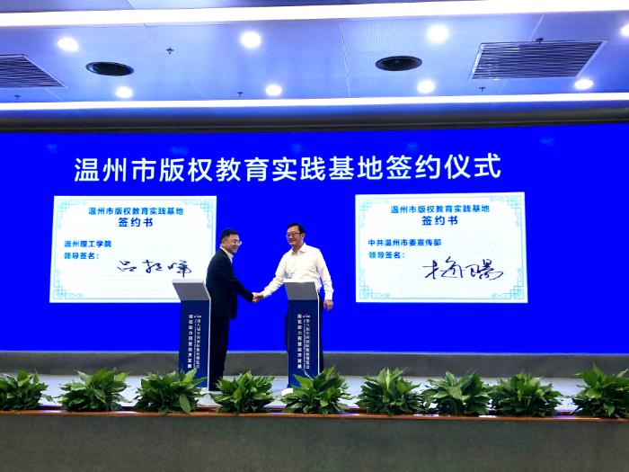 作为受邀嘉宾,版博会期间我校领导与温州市委宣传部签订温州市版权教育实践基地共建协议,借助温州理工学院艺术设计学院在版权研究及推广领域的人才优势和经验优势大力推进温州版权人才培养,突出版权宣传阵地建设,宣传普及版权知识,全面提升公众版权保护意识。