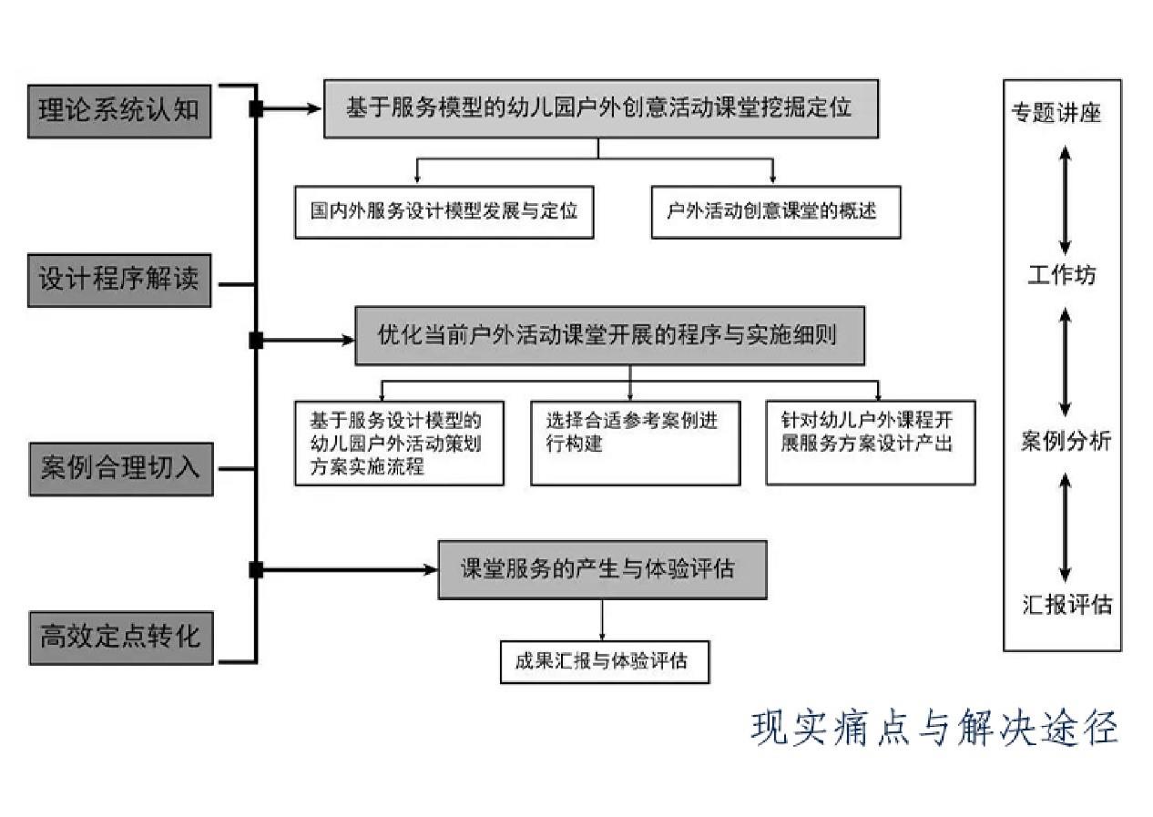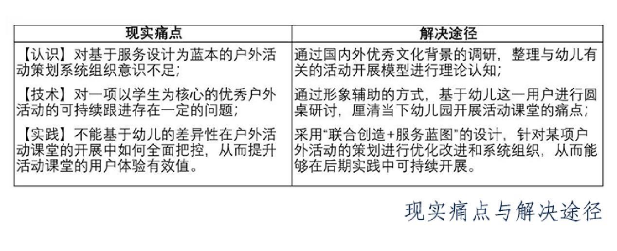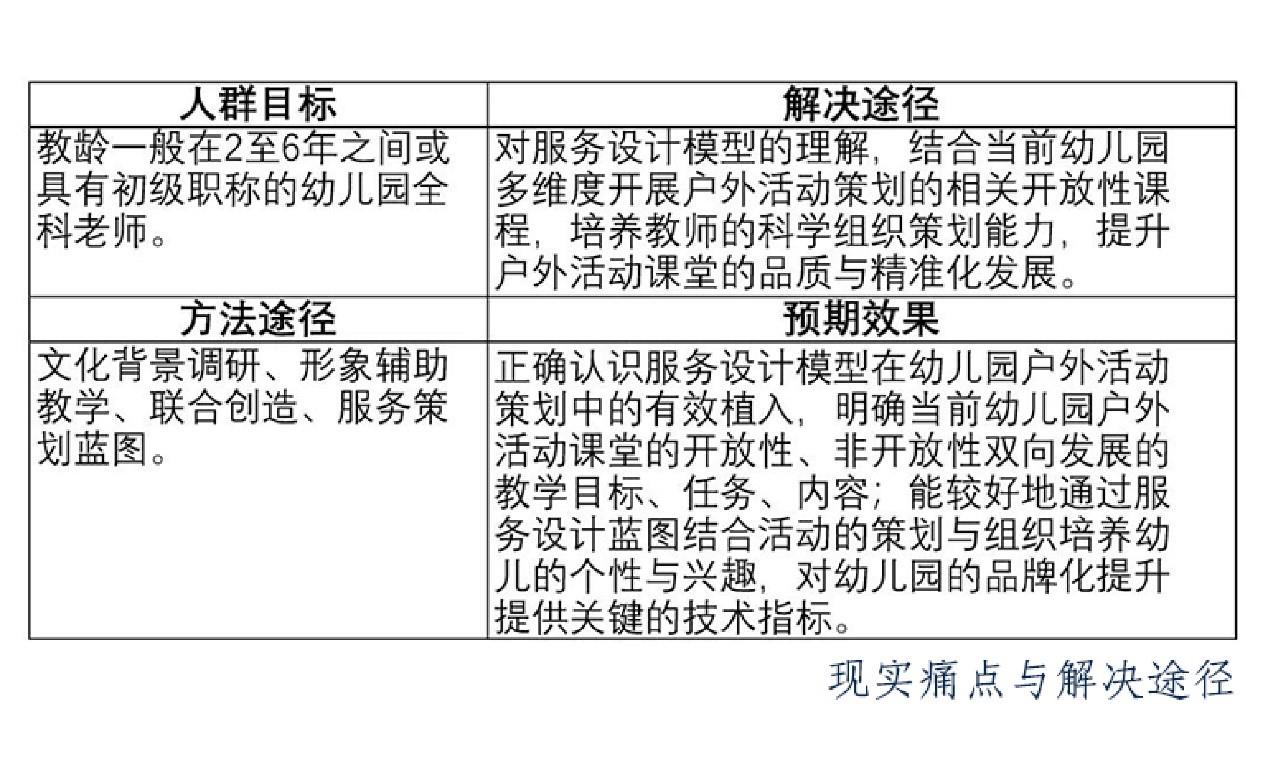 服务设计是一种设计思维方式,即人与人一起创造与改善服务体验。这些体验随着时间的推移发生在不同接触点上(比如幼儿园户外活动开放式课堂的策划)。它强调合作以使得共同创造成为可能,让服务体验变得更加有用,可用,高效,有效和被需要,是全新的、整体性强、多学科交融的综合领域。基于幼儿园户外活动策划能力的提升,是服务设计以关键的“用户为先+追踪体验流程+涉及所有接触点+致力于打造完美的用户体验”这一服务蓝图为基准的技术指标。