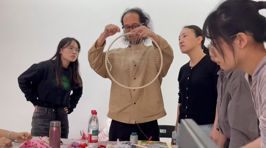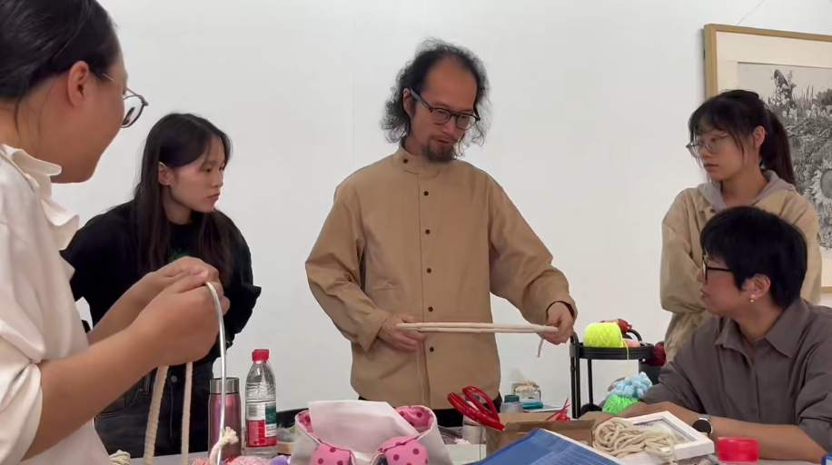 两位教师带领学员学习传统手工编织的手法,运用不同的创作材料进行实践实验,在教师指导下进行传统手工编织,期间教师指导学员的编织手法及材料选择的方法。在课程的最后,教师对学员的作品进行点评,并对日后中小学美术课程的相应结合运用进行探讨。
