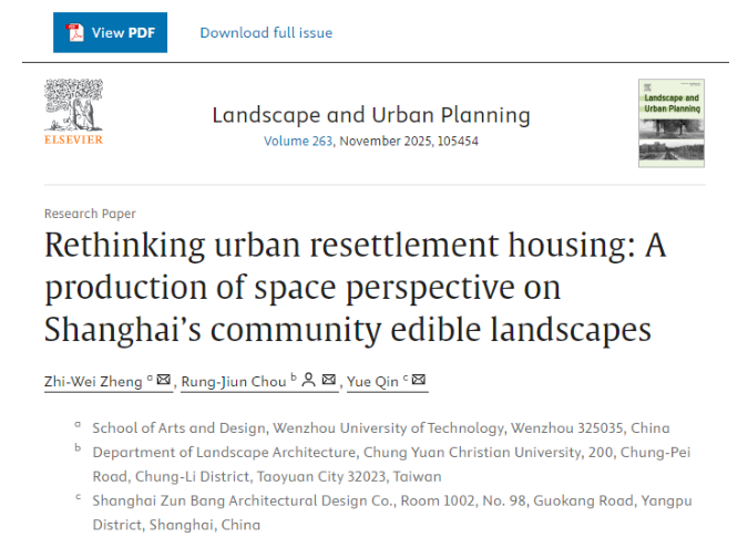近日,我校设计艺术学院教师郑志伟,在国际顶级期刊《Landscape and Urban Planning》上发表了题为《Rethinking urban resettlement housing: A production of space perspective on Shanghai's community edible landscapes》的最新研究成果。郑志伟老师为论文第一作者,我校为论文第一作者署名单位。