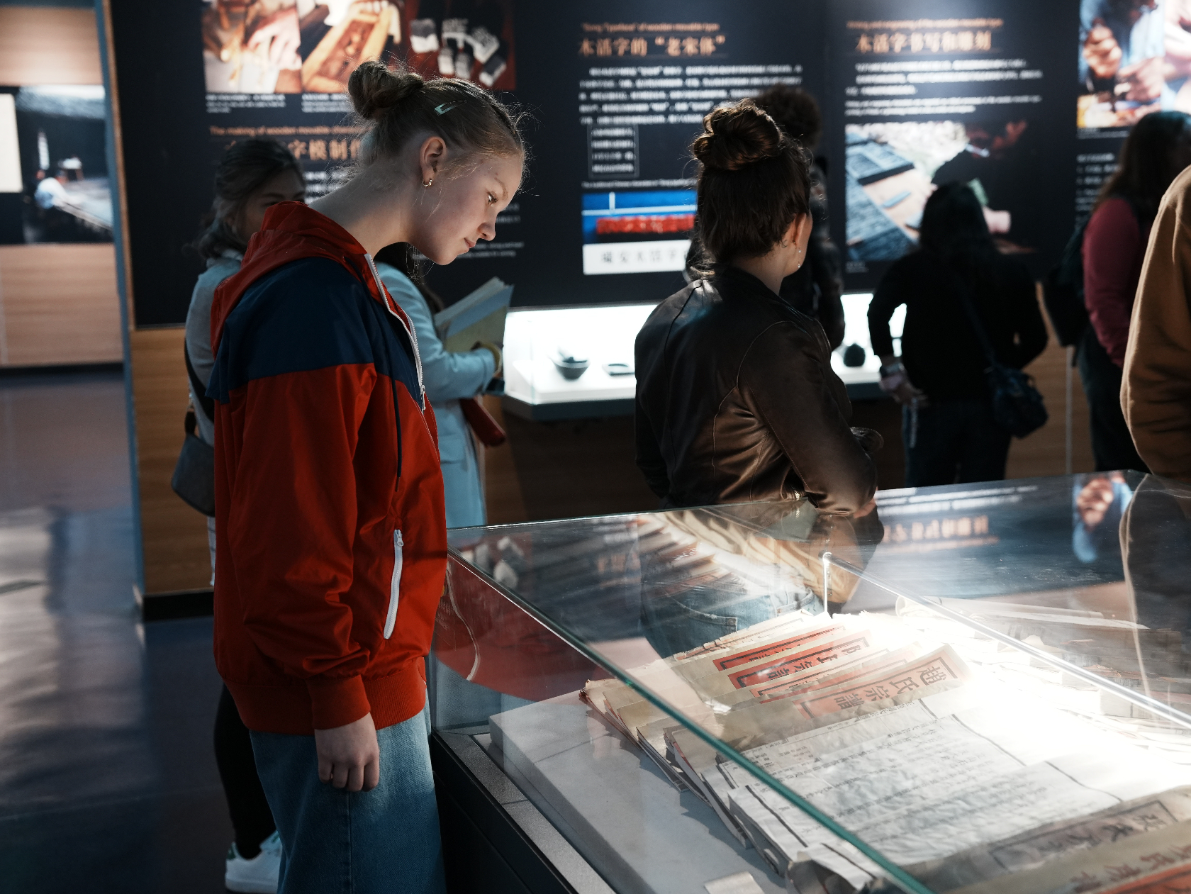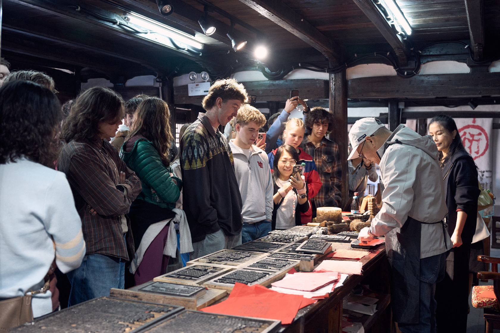 研学队伍首站抵达瑞安东源村,解锁“活着的非遗”——木活字印刷术。在展示馆内,讲解人员细致介绍印刷术的起源与发展历程,各类印刷产品及文物让他们直观感受技艺传承;走进实践中心,非遗传承人亲身示范木活字印刷流程,指导他们循着“刻字、拣字、排版、印刷”的古法步骤操作。美国青少年指尖摩挲温润木活字,认真比对字形、精准摆放字模,再以毛刷轻刷油墨、覆纸按压,看着空白纸张上渐渐浮现清晰字迹与惟妙惟肖的插画,在实践中读懂古老印刷术背后的智慧与汉字文化的独特魅力。