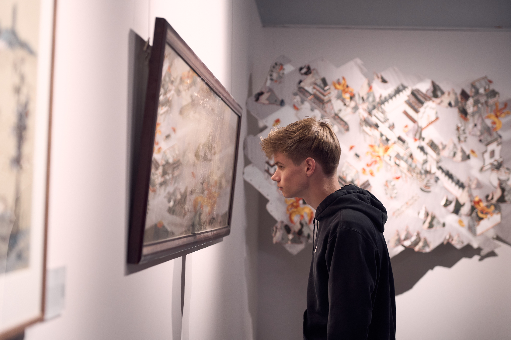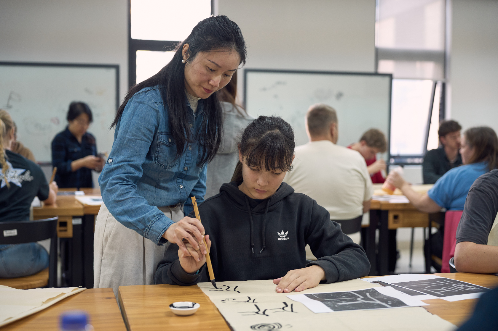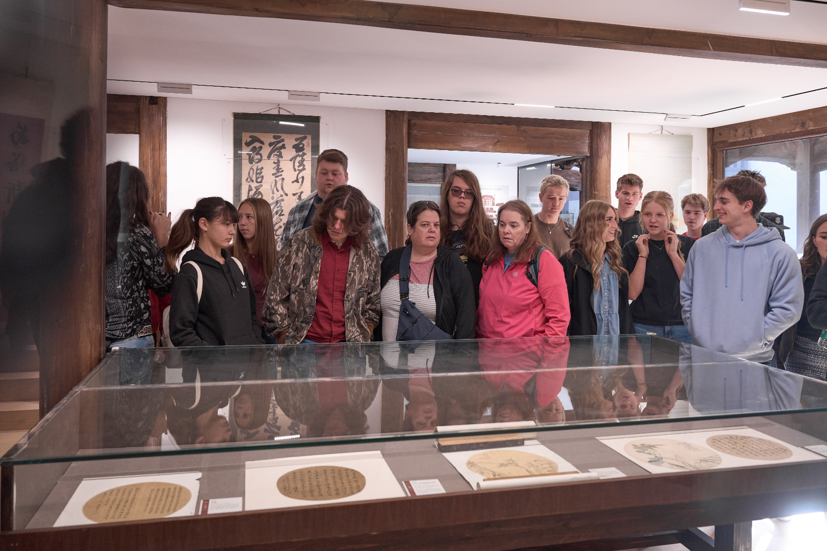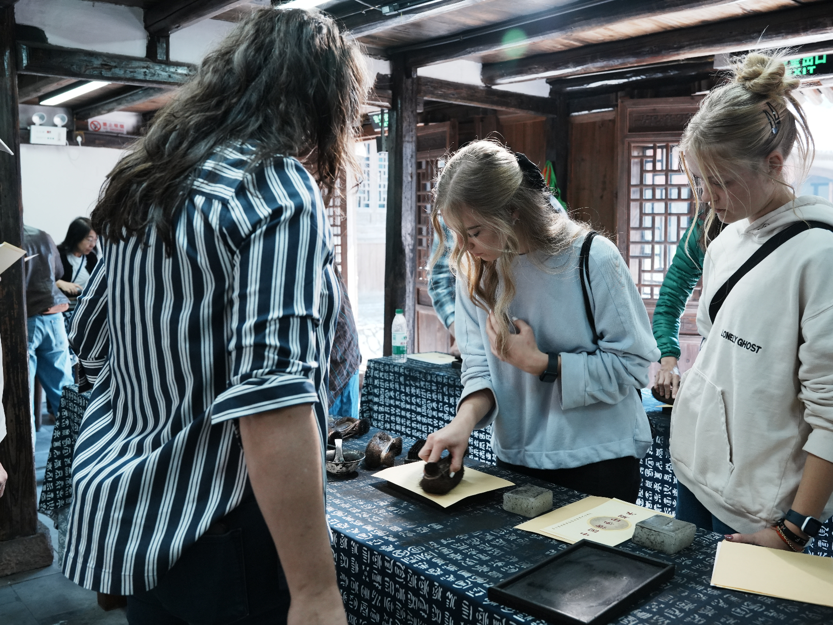 清晨的墨池坊,浸在江南薄雾中,青石板路蜿蜒向前,白墙黛瓦间藏着千年文脉。美国青少年在温州理工学院设计艺术学院师生的陪伴下,走进这一温州文化地标,开启书画之约。中文老师与墨池坊文化向导相互配合,用生动语言为友人们讲述墨池坊的历史渊源;走进书画展示空间,楷书的端庄工整、行书的飘逸流畅、山水画的意境悠远、花鸟画的栩栩如生,让他们驻足惊叹。老师讲解作品创作背景与绘制材质,志愿者适时补充小知识,他们一边认真聆听、凑近观赏,定格跨越国界的文化共鸣。