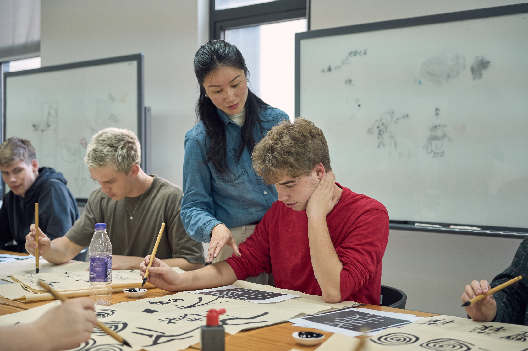 书法体验环节,在书法教师的带领下,美国青少年开启了与汉字的深度对话。老师在讲解书法的历史渊源的基础上,聚焦“仁义礼智信”五个汉字,用通俗语言解读内涵。这五个承载中国传统美德核心的汉字,引发了他们强烈的求知欲,大家听得认真,不时点头回应。接着,老师示范毛笔握笔姿势与基本笔画运笔技巧。从握笔的生疏试探,到笔尖在宣纸上缓缓移动,他们屏息凝神,看着墨汁在宣纸上晕开,陌生的方块字渐渐展现出线条的韵律与力量。尽管笔画略显稚嫩、结构有些“可爱”,但每一笔都饱含对中国文化的喜爱。当完整的“仁义礼智信”呈现在纸上时,友人们纷纷举起作品拍照留念,脸上满是成就感,还不停追问每个字的更多含义。有人认真书写自己的中文名,有人尝试写下其他汉字,有人请老师帮忙书写中文名并热情合照。墨香氤氲中,语言隔阂悄然消散,只余对文化之美的共同热爱。
